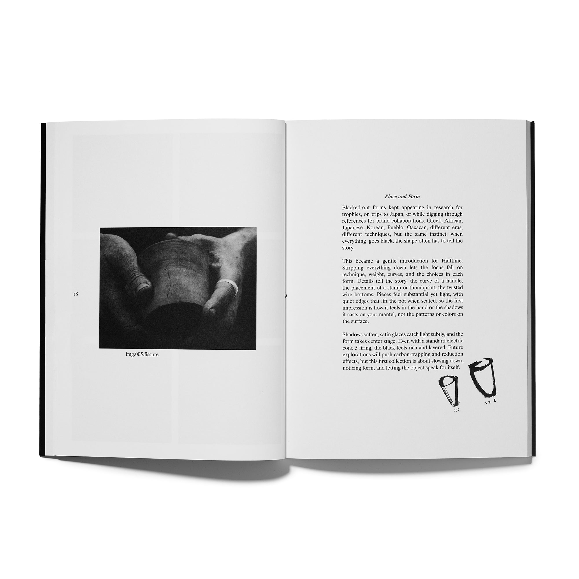 Blackware was published on the occasion of Studio Halftime’s release of Collection 001. The book documents Lev Rosenbush’s ceramic practice, drawing on ten years of material research and experimentation. Through edited anecdotes and process documentation, Blackware offers insight into the development of the collection. Designed by Noam Ballon of Azou Studio, the book interprets Rosenbush’s working process through form. Photography by Jesse Russell and film stills by Isiah Suko.